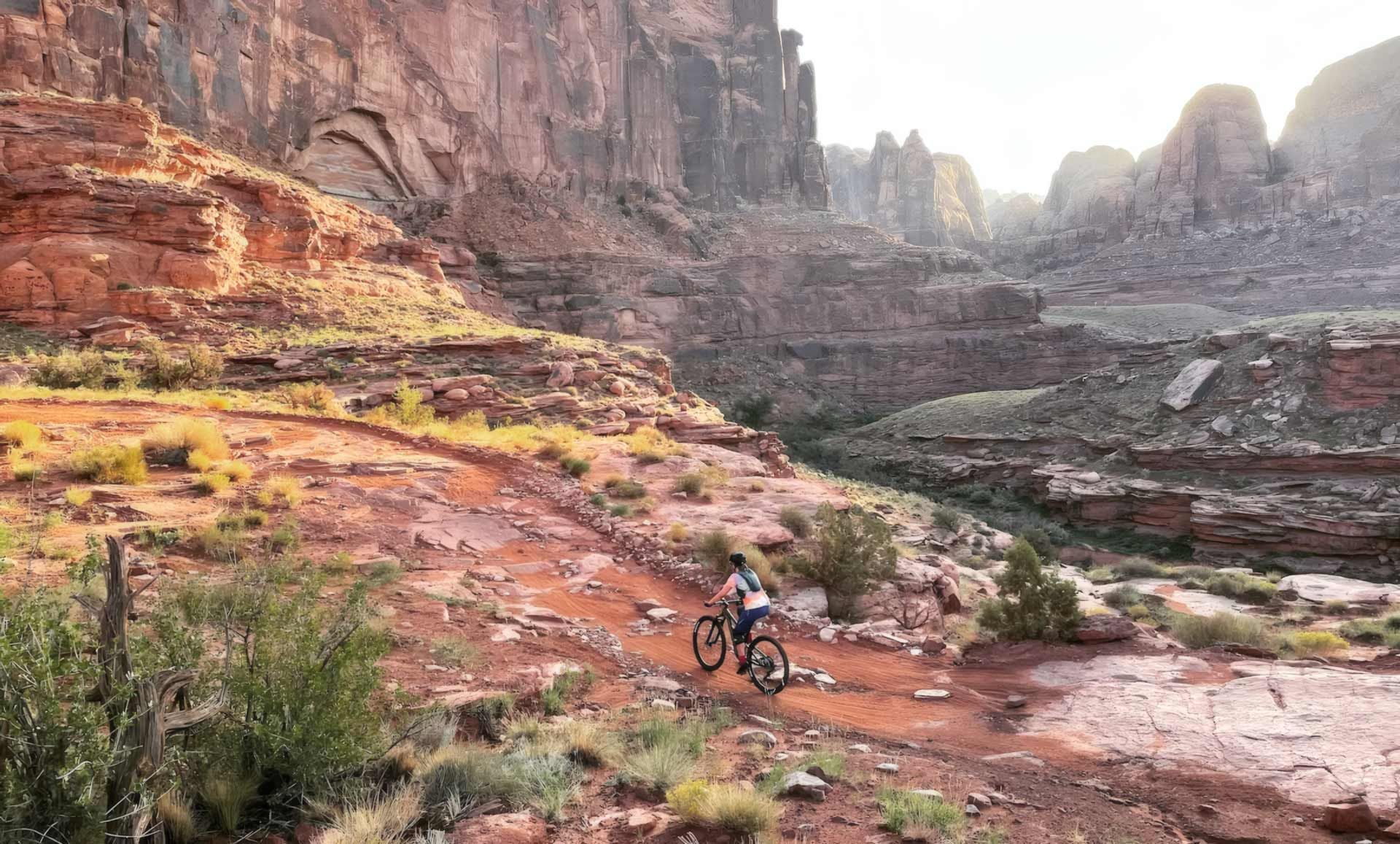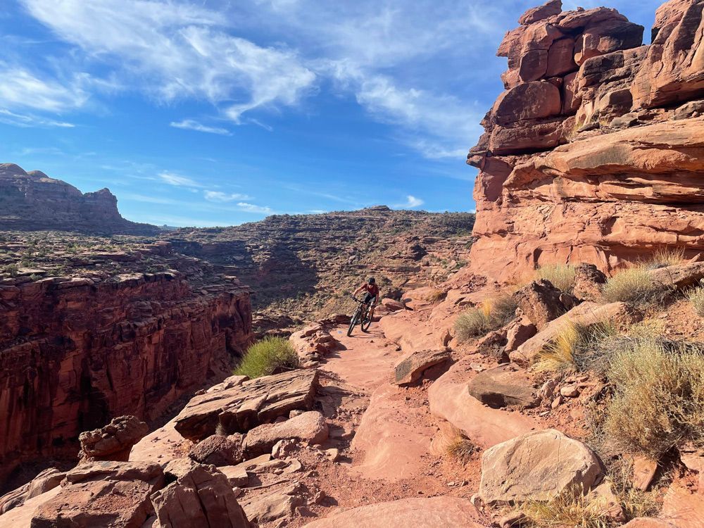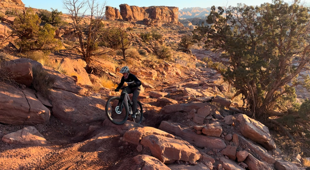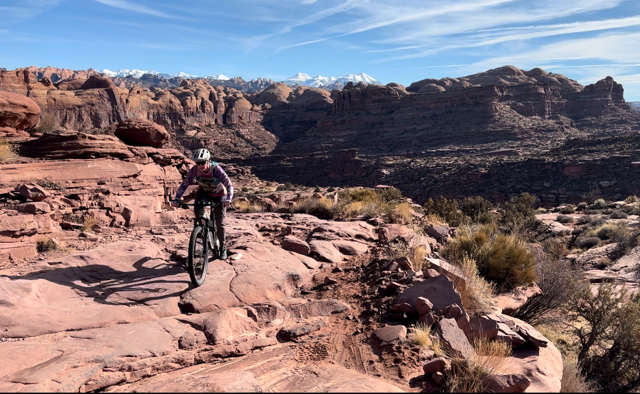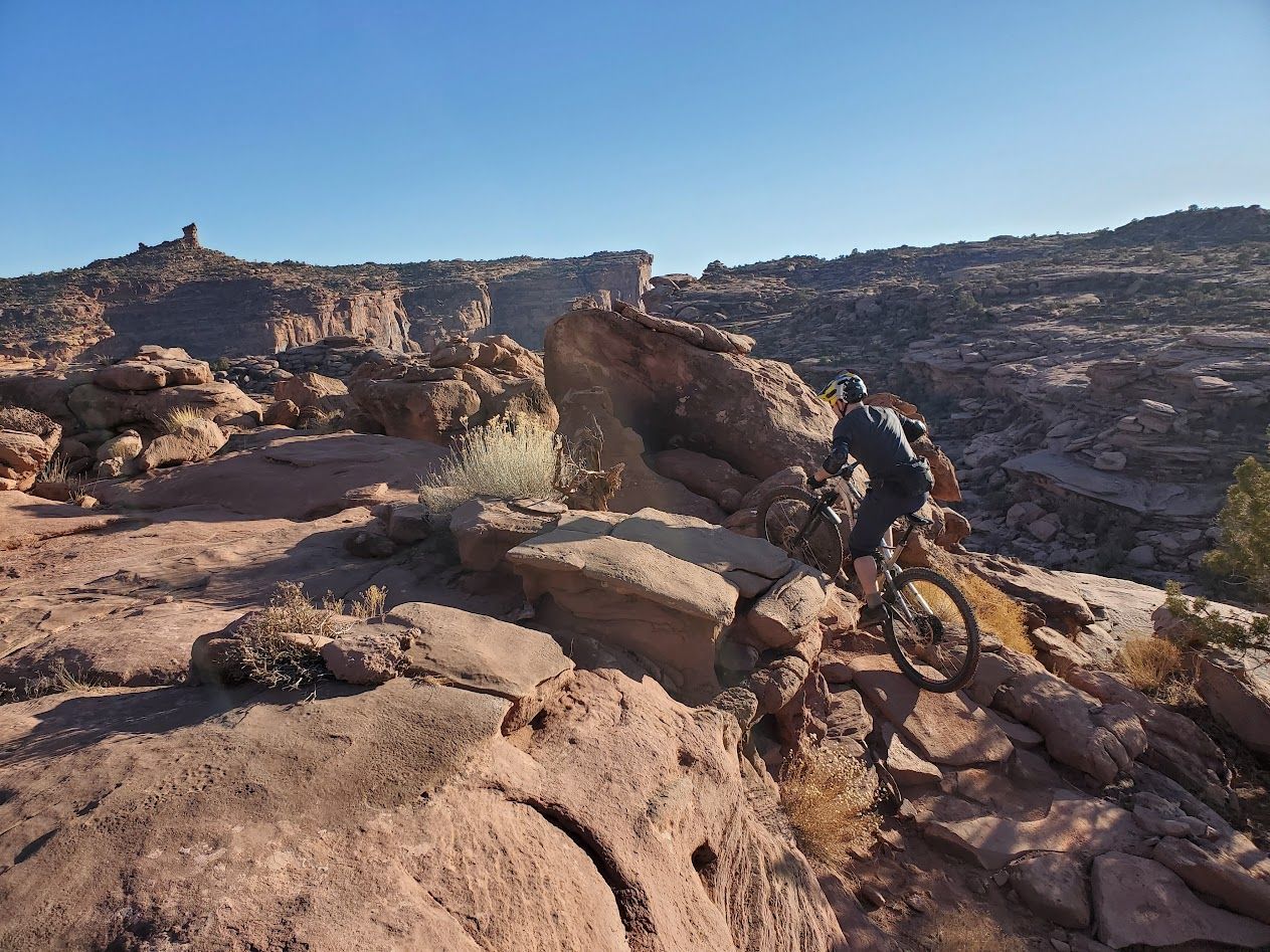 If you are an experienced rider we all say: DO NOT LEAVE MOAB WITHOUT DOING THIS! Up the beautiful Kane Creek Canyon is one of the most stunning and magical places in Moab with riding that has the most advanced technical features for a single black condensed into Ahab and Rockstacker; and introduces a double black on Jackson. For a rider with fitness and a willingness to learn there is the blue trail Hyamas that will help you build your tech uphill and downhill skill like nowhere else in Moab. The single black trail Captain Ahab by far, when consulting our climbing & downhill lovers, is one of the most fun rides you will ever do. Our guides can treat you to lines, advice about handling your bike, and cheer you on up the climbs.